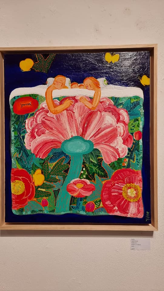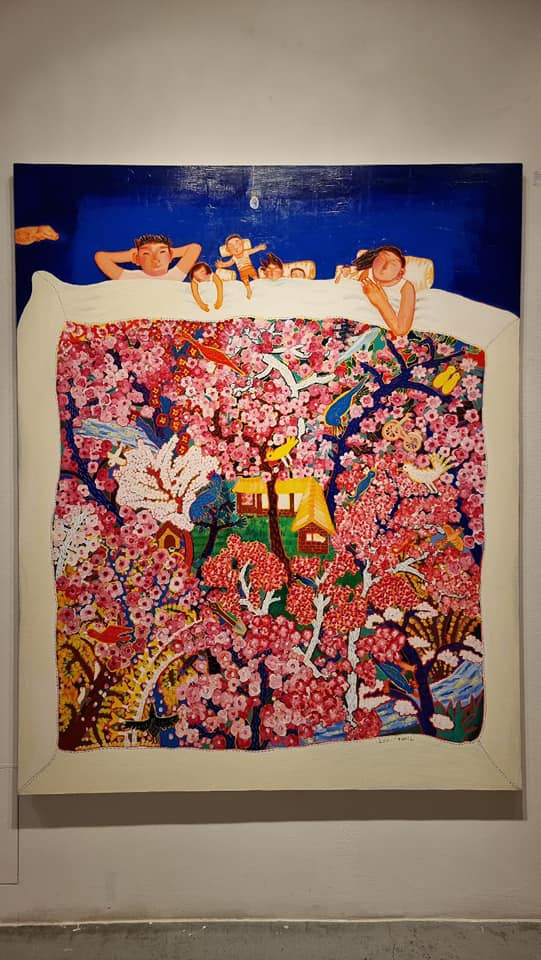 가족들이 덮고 있는 이불에 그려진 꽃들과 물고기와 사과들은 힘든 세상과 맞닥뜨리는 순간의 우리들이 꿈꾸는 이상향의 세계일 수 있지 않을까 생각해본다.